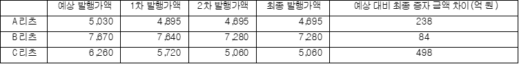 <국내 리츠 유상증자 당시 예상 발행가액과 최종 발행가액 차이>