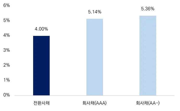 부채 조달의 측면에서는 상대적으로 낮은 금리에 발행이 가능하다는 점도 장점으로 작용할 수 있습니다. 일반적인 부채 조달 대비 향후 자본으로 전환이 가능한 옵션을 부여하기 때문에 옵션의 가치만큼 낮은 금리를 적용할 수 있습니다. 2022년 12월 당시 SK리츠가 발행한 전환사채의 쿠폰 금리는 4%로, 당시 AA- 등급의 3년물 회사채 금리 5.36%에 비해 유의미하게 낮은 수준이었습니다.