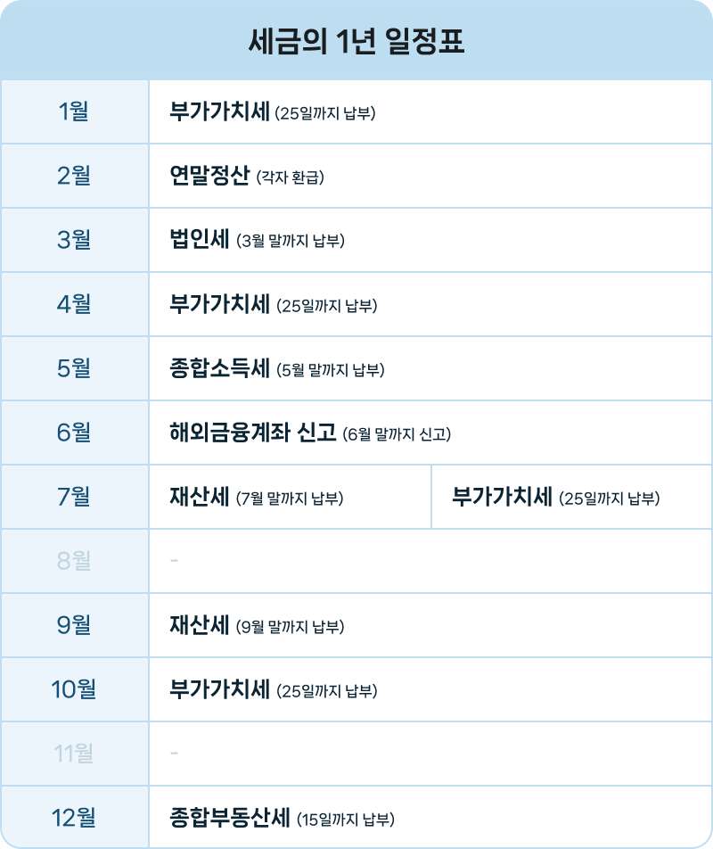 새해가 되었으니 2025년 한 해의 재무계획을 세워 보는 분들도 많으실 것으로 생각합니다. 들어올 돈은 최대한 늘리고, 나갈 돈은 가급적 줄이고 싶은 것이 모두의 공통된 마음일 텐데요. 이번 회차에서는 나갈 돈 중에서 놓치기 쉬운 대표 항목인 세금의 1년 일정표를 알아보겠습니다.